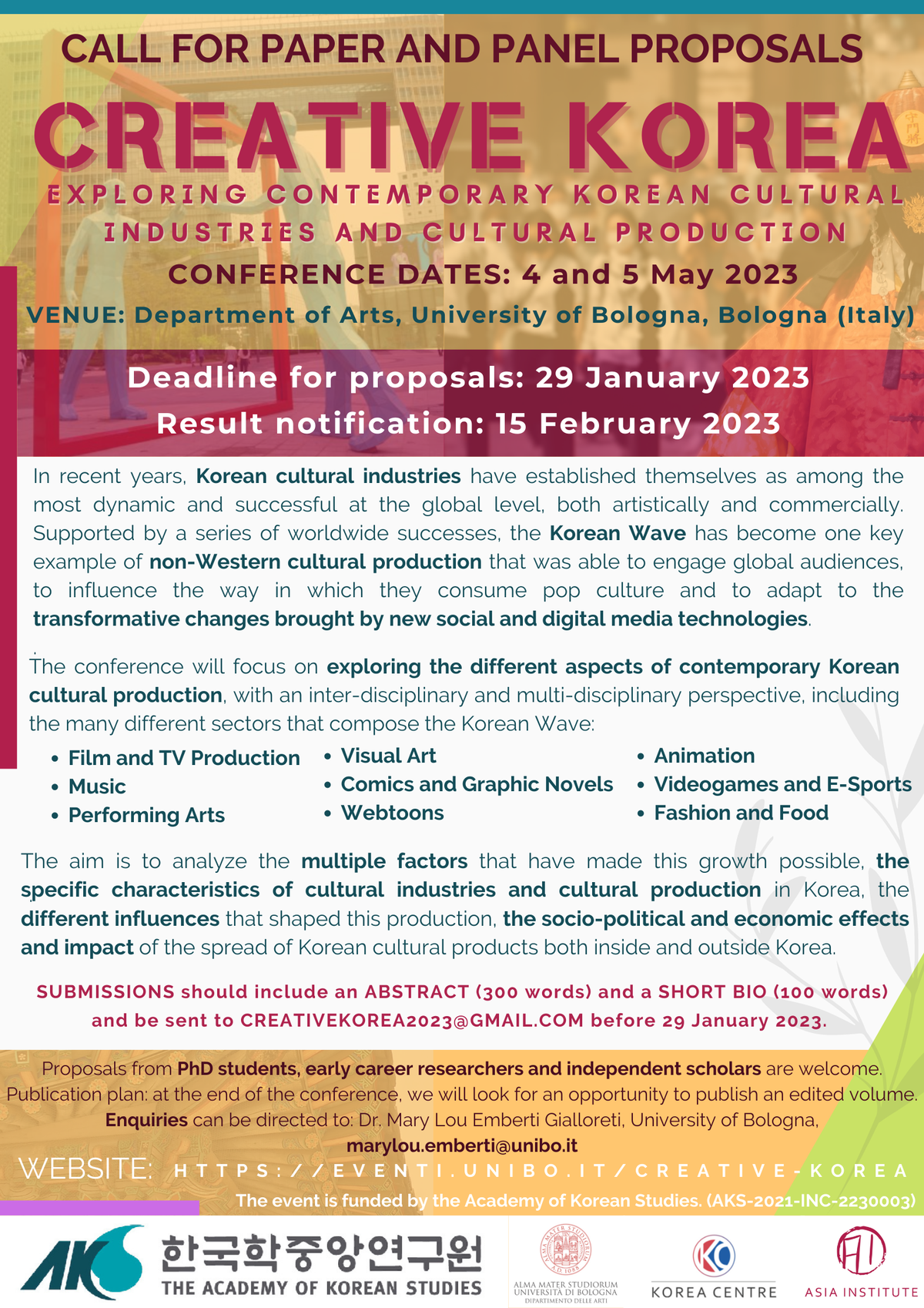 La conferenza, che l'Università di Bologna è lieta di ospitare a maggio 2023, mira ad analizzare i molteplici fattori che hanno reso possibile questa crescita, le caratteristiche specifiche delle industrie culturali e della produzione culturale in Corea, le diverse influenze che hanno modellato questa produzione, gli effetti socio-politici ed economici e l'impatto della diffusione dei prodotti culturali coreani sia all'interno che all'esterno della Corea.
