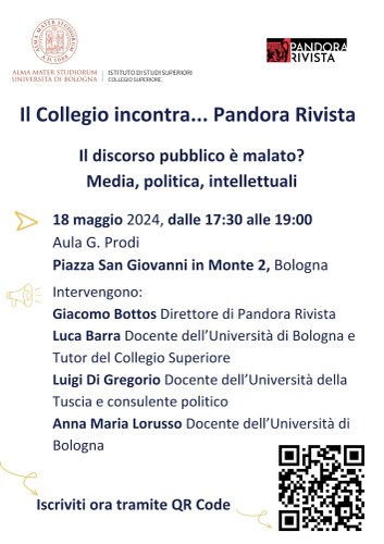 Il Collegio Superiore e Pandora Rivista presentano alla comunità dell’Ateneo un dialogo su queste tematiche attraverso le voci del Direttore di Pandora Rivista Giacomo Bottos, del Prof. Luca Barra (Università di Bologna e Collegio Superiore), del Prof. Luigi Di Gregorio (Università della Tuscia e consulente politico) e della Prof.ssa Anna Maria Lorusso (Università di Bologna).