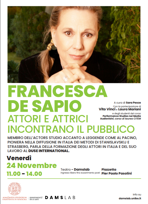 Intervista pubblica con Francesca De Sapio, attrice formatasi negli anni Sessanta negli Stati Uniti e diventata membro dell’Actors Studio insieme a figure storiche di quell’ambiente artistico, prima di tutto Al Pacino. De Sapio è perciò memoria vivente di un’epoca fondativa della formazione degli attori in Usa e figura decisiva per la diffusione in Italia di quel patrimonio culturale. Fonda, infatti, nella metà degli anni Ottanta, la scuola Duse Studio, ora Duse International con sede a Roma. Dal suo laboratorio sono passati molti tra i nostri maggiori attori di cinema e teatro. Nel 2025 viene insignita di due prestigiosi premi internazionali "Le Cattedrali Letterarie Europee" e il "Swann Awards" 2025, per il suo contributo duraturo alla formazione teatrale e cinematografica in Europa e nel mondo. Attraverso estratti filmici proiettati in sala, si parlerà di Method Acting e derivazioni da Stanislawskj e Strasberg in Italia. Partecipa all’iniziativa Vito Vinci, attore e regista, e Laura Mariani, studiosa e docente di storia dell’attore.