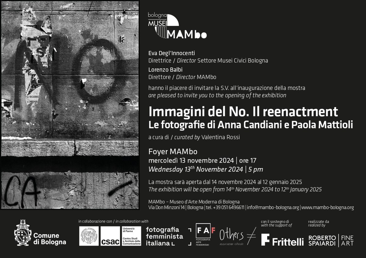 L’anno 2024 segna il cinquantesimo anniversario del progetto Immagini del No. Molti degli ideali e delle lotte delle donne nati all’interno del movimento femminista negli anni Settanta perdu-rano oggi nelle nuove sfide al centro del dibattito pubblico. Ciò rende il progetto di Candiani e Mattioli straordinariamente attuale alla luce del percorso di libertà che le donne avviarono in passato e che continua oggigiorno. In virtù di questa riflessione, la mostra storica del 1974 rivi-ve al MAMbo riproponendo i pannelli circolari contenenti le ristampe delle fotografie di Paola Mattioli e Anna Candiani.