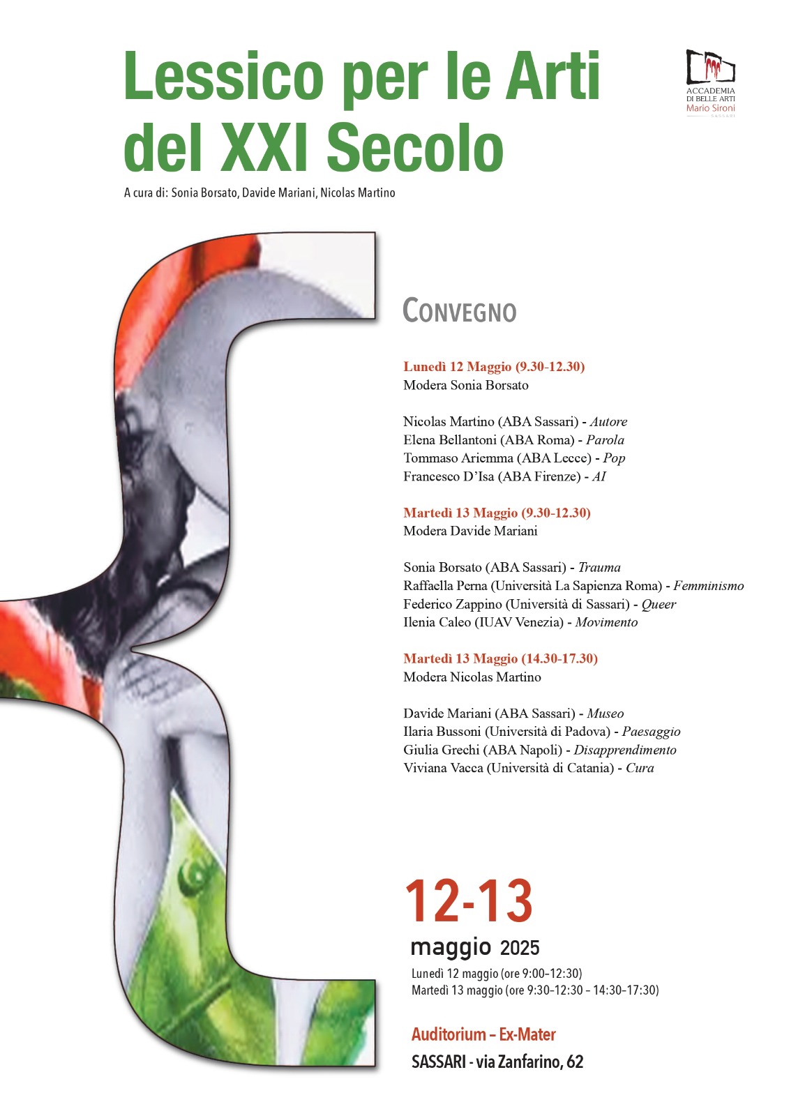 Il 12 e 13 maggio all'Accademia di Belle Arti di Sassari si riuniranno studiosi con formazioni diverse provenienti da Accademie e Università italiane. In questa occasione alcune delle voci più interessanti e originali del panorama critico e artistico contemporaneo presenteranno i risultati delle loro ricerche intorno al “Lessico per le Arti del XXI Secolo” con l'intento di confrontarsi e avviare ulteriori percorsi di collaborazione tra Accademie e Università.