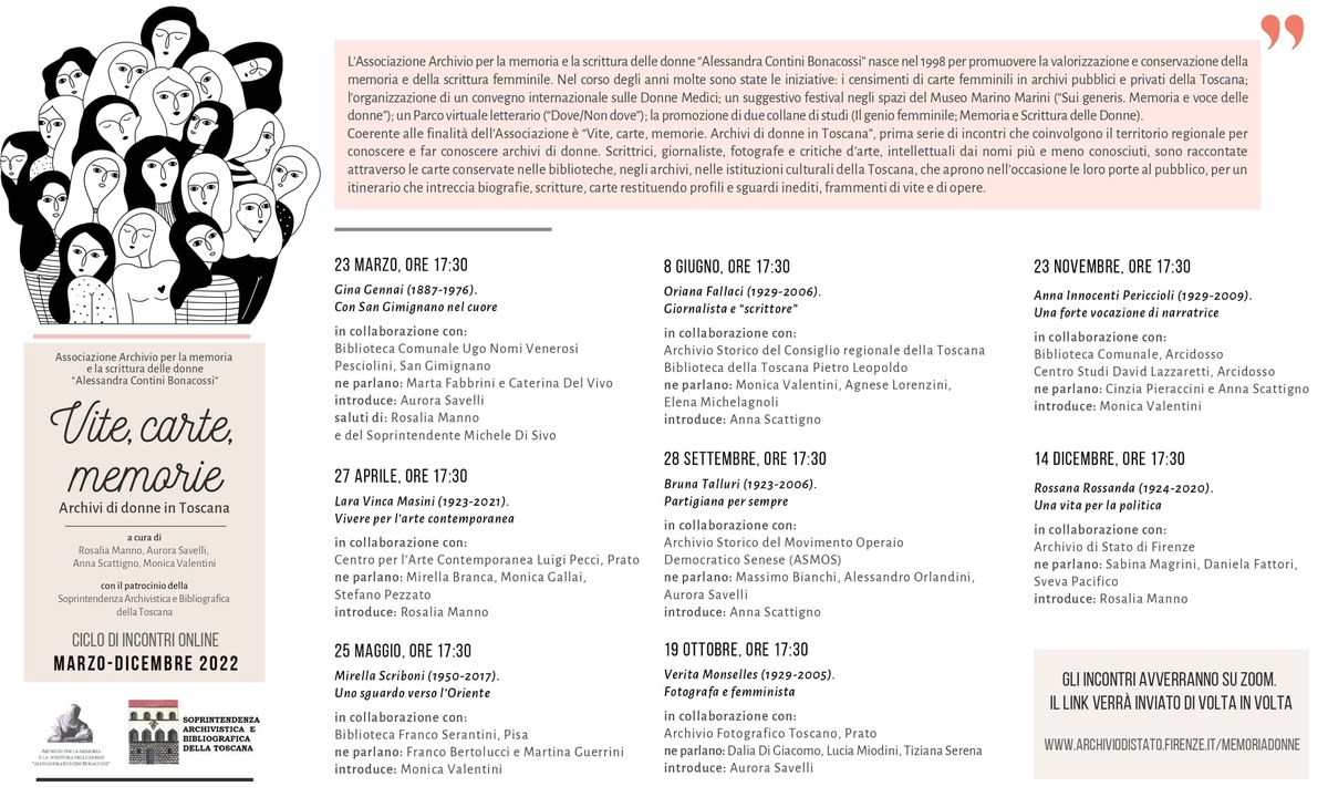 Ciclo di incontri online promosso dall’Archivio per la memoria e la scrittura delle donne “Alessandra Contini Bonacossi", con il patrocinio della Soprintendenza Archivistica e Bibliografica della Toscana.