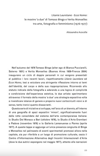 From the beginning of the twenty-first century, the expression photobook has proven highly successful in the wake of a rich series of studies, festivals, workshops, fairs, and publishing initiatives. The term photobook has, however, often been used to indicate, without much distinction, different types of photographic books that do not necessarily share aesthetic, political, or social aims, generating misleading perspectives on the genre. In order to examine the history of feminist photobooks in Italy in the 1970s, this article analyzes both the material and symbolic structures of these books as well as the contexts of their production and circulation, the artists’ careers, and their relationship to Italian neofeminism. Through a selection of books, the article offers case studies that can be considered significant examples of the relationship between photography, artist’s books, and feminist politics in the specific context of Italy in the 1970s.