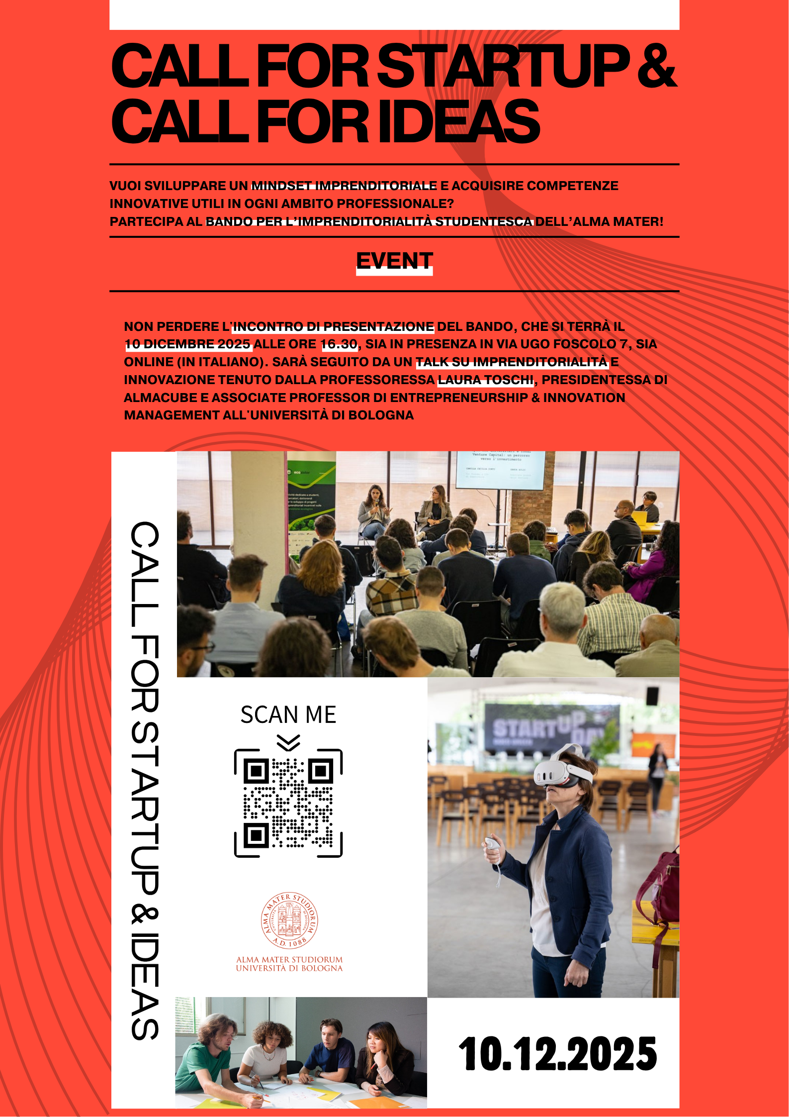 L'incontro, in italiano con materiale di supporto in inglese, ti permetterà di conoscere in dettaglio l'attività e le modalità di partecipazione. Sarà seguito da un talk su imprenditorialità e innovazione tenuto dalla professoressa Laura Toschi, presidentessa di Almacube e Associate Professor di Entrepreneurship & Innovation Management all'Università di Bologna.
